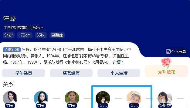 可那时,汪峰心里已经有了比他小17岁的模特葛荟婕。葛荟婕18岁生下小苹果,汪峰曾承诺到年龄就领证,但最终却以太爱玩不会持家为由分手。 和葛荟婕分手没多久,汪峰又和比他小15岁的康作如领了证,2012年生下了汪璟怡。然而,女儿才8个月大还在哺乳期,他就提出了离婚。